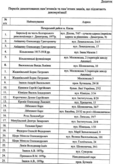 По его данным, к списку из 47 памятников и памятных знаков, демонтированных в 4 районах столицы с абсолютным лидерством Печерского района, добавились 17 объектов в Шевченковском районе, 8 демонтированных службами Днепровской РГА памятных досок лицам, причастным к голодомору 1932-1933 гг, а так же памятники Ленину с территории предприятий Святошинского района.