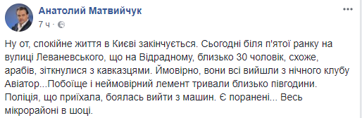 "Ну вот, спокойная жизнь в Киеве заканчивается. Сегодня около пяти утра на улице Леваневского, что на Отрадном, около 30 человек, похоже, арабов, столкнулись с кавказцами. Вероятно, они все вышли из ночного клуба Авиатор ... Побоище и невероятный крик продолжались около получаса. Полиция, приехавшая боялась выйти из машин. Есть раненые ... Все микрорайоне в шоке", - написал он.
