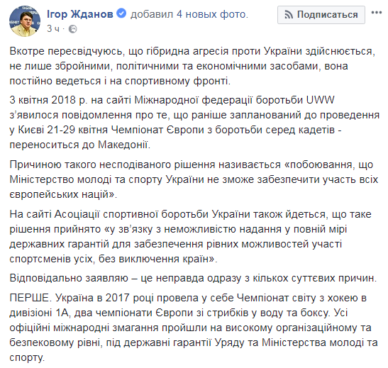 Министр молодежи и спорта Игорь Жданов назвал перенос из Киева в Скопье чемпионата Европы по спортивной борьбе - "местью Украины за бойкот международных соревнований в России".