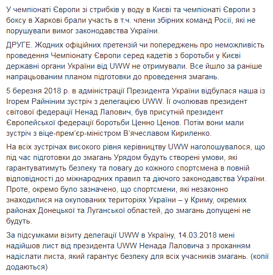 “На всех встречах высокого уровня руководству UWW отмечалось, что во время подготовки к соревнованиям правительством будут созданы условия, гарантирующие безопасность и уважение к каждому спортсмену в полном соответствии с международными правилами и действующим законодательством Украины. Однако отдельно было отмечено, что спортсмены, которые незаконно находились на оккупированных территориях Украины — в Крыму, отдельных районах Донецкой и Луганской областей, к соревнованиям допущены не будут”, - отметил Жданов.