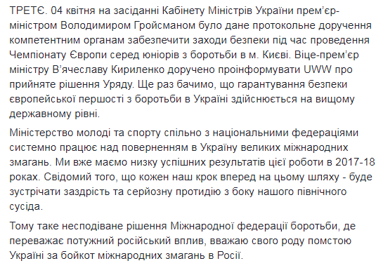 "...Такое неожиданное решение (о переносе чемпионата Европы среди кадетов из Киева — Прим.Ред.) Международной федерации борьбы, где преобладает мощное российское влияние, считаю своего рода местью Украины за бойкот международных соревнований в России", - заявил Жданов.