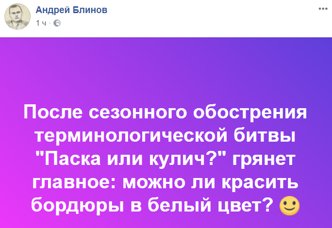 "После сезонного обострения терминологической битвы "Паска или кулич?" грянет главное: можно ли красить бордюры в белый цвет?" – пишет журналист Андрей Блинов, говоря о недавнем высказывании замминистра регионального развития Льва Парцхаладзе, который ополчился на очередной "пережиток совка" – покраску бордюров.