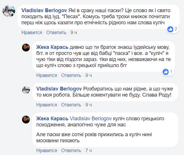 Но нашлись и такие, кто считает, что даже слово "паска" – не совсем подходящее для украинцев. Один из пользователей заявил, что оно происходит из еврейского языка. На что глава С14 ответил потоком оскорблений и напомнил, что кулич – тоже не славянское, а греческое слово.