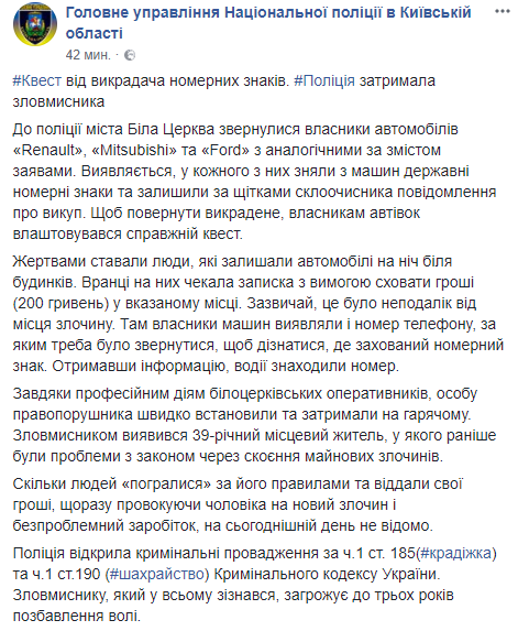 "В полицию города Белая Церковь обратились владельцы автомобилей Renault, Mitsubish и Ford с аналогичными по смыслу заявлениями. Оказывается, у каждого из них сняли с машин государственные номерные знаки и оставили за щетками стеклоочистителя сообщение о выкупе. Чтобы вернуть похищенное, владельцам автомобилей устраивался настоящий квест", - говорится в сообщении.