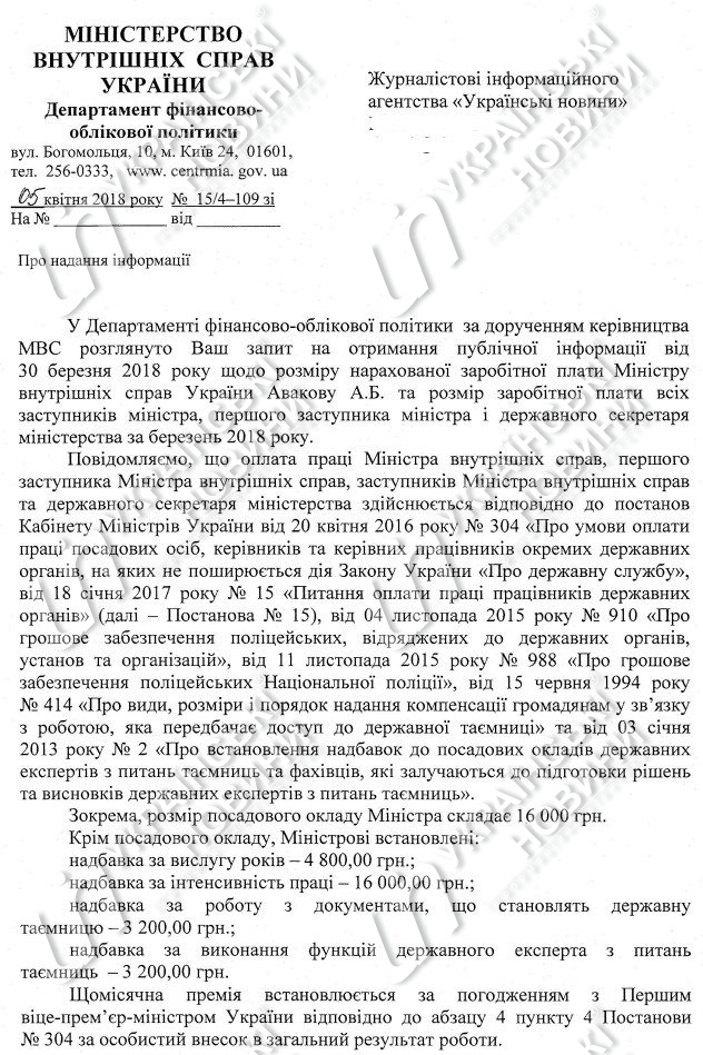 Зарплата министра внутренних дел Арсена Авакова за март составила 103,8 тыс. гривен, его заместителей - от 70,4 тыс. до 103 тыс. гривен, государственного секретаря министерства - 86,6 тыс. гривен.
