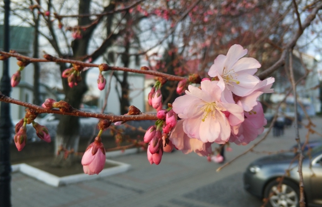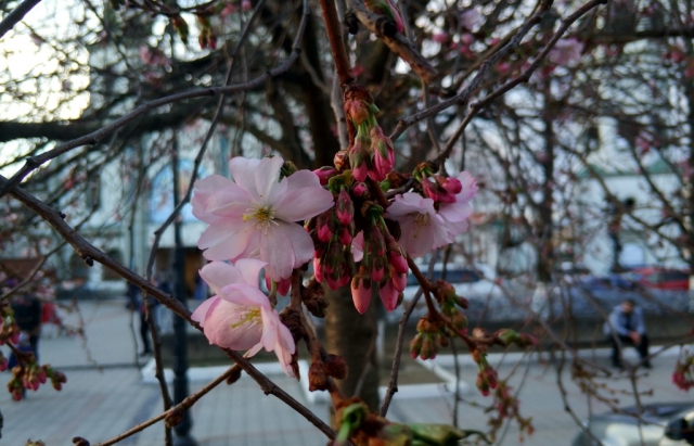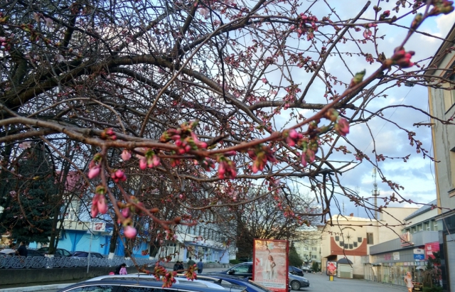 В центре города Мукачево Закарпатской области зацвела первая сакура.