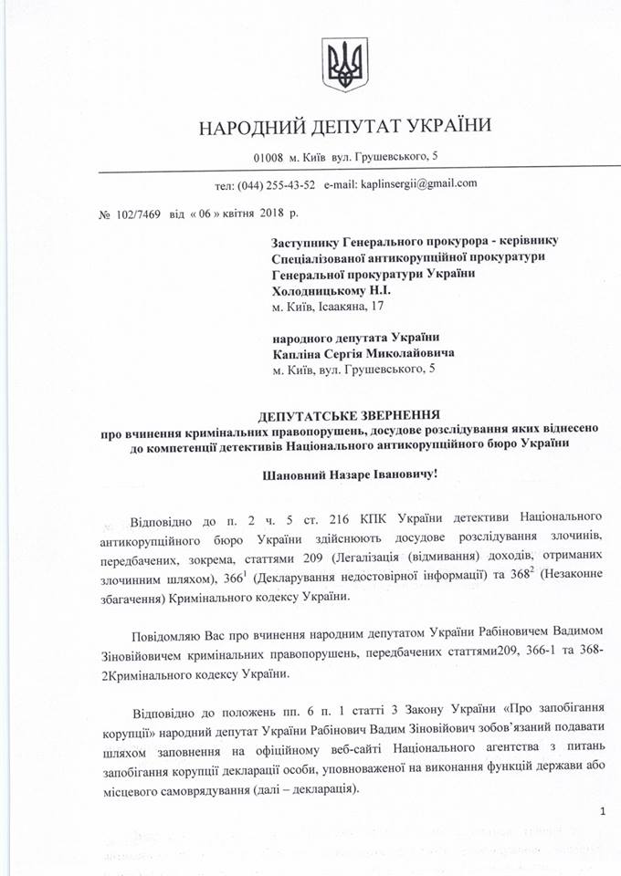Отметим, что это не первая акция Каплина против Вадима Рабиновича. Ранее нардеп уже посылал запрос с требованием открыть уголовное производство по фактам недостоверного декларирования и незаконного обогащения нардепа Рабиновича, после чего стало известно, что НАБУ расследует два дела против него.