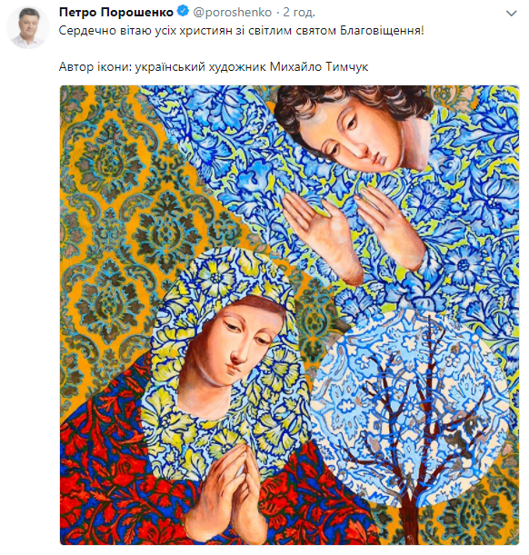 В субботу, 7 апреля, президент Украины Петр Порошенко поздравил всех христиан с праздником Благовещения. Поздравления глава государства опубликовал в Twitter.