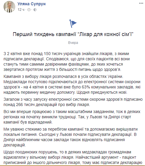 Уже больше 150 тысяч украинцев подписали декларации с врачами. Об этом в Facebook сообщила и. о. министра здравоохранения Ульяна Супрун.
