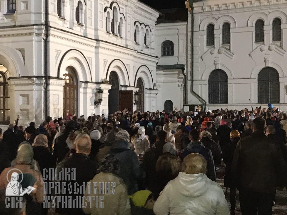 23:35 В Лавре готовятся к крестному ходу вокруг Успенского собора. Священнослужители уже выстраиваются в колонну, держа хоругви наизготовку.