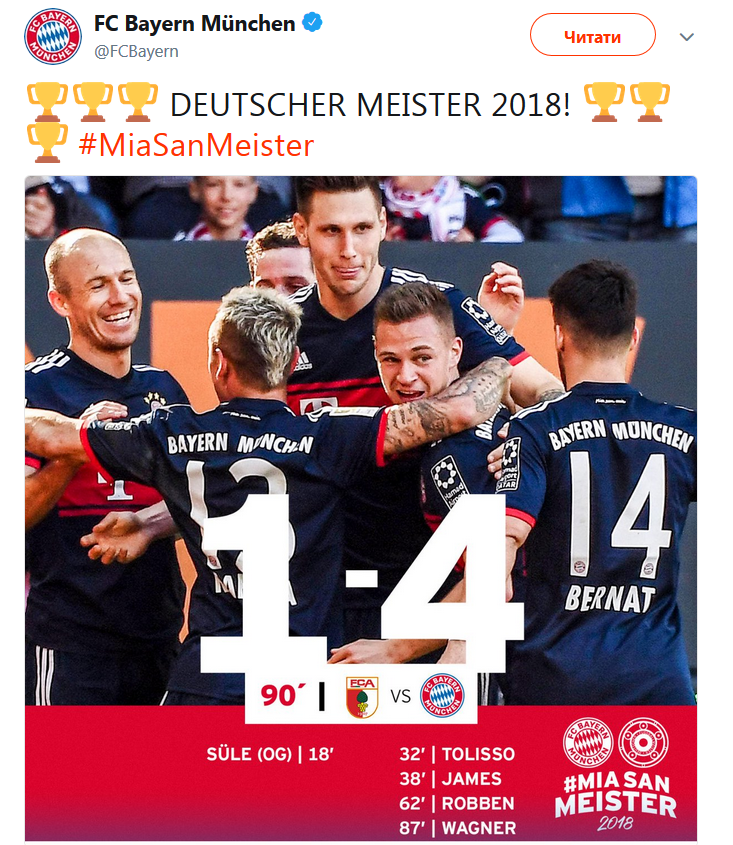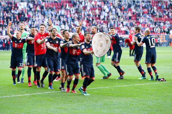 Cегодня, 7 апреля, мюнхенская Бавария разгромила на выезде Аугсбург со счетом 4 - 1 и досрочно стала чемпионом Германии. Бавария завоевала Серебрянную салатницу 28-й раз в истории и 6-й раз подряд.