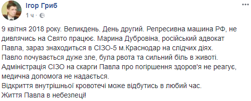 "Павел чувствует себя очень плохо, была рвота и сильная боль в животе. Администрация СИЗО на жалобы Павла об ухудшении здоровья не реагирует, медицинская помощь не оказывается. Открытие внутреннего кровотечения может произойти в любое время. Жизнь Павла в опасности", - написал в соцсети отец Павла.
