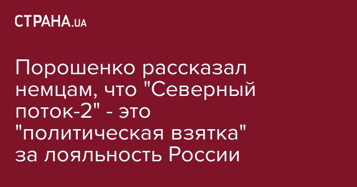 "Немецкие политики и компании должны помнить о том, что "Северный поток-2" это исключительно политической проект, который финансирует Россия. Простите за грубые слова, но "Северный поток-2" это политическая взятка за лояльность России, цель которой экономическая и энергетическая блокада Украины и нанесение ей большого ущерба", - заявил Порошенко