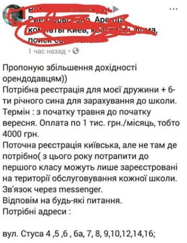 "Необходима регистрация для моей семьи и 6-летнего сына для зачисления в школу. Срок: с начала апреля по начало сентября. Оплата по 1 тыс. в месяц", - говорится в одном из объявлений на странице аренды жилья в соцсети Facebook.