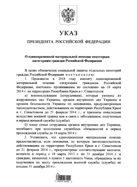 Президент России Владимир Путин подписал указ о выплате единовременной матпомощи бывшим военным и сотрудникам МВД Украины, оставшимся в аннексированном Крыму.