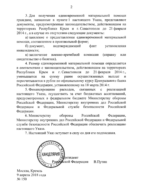 Согласно опубликованному на портале правовой информации документу, выплаты получат бывшие служащие органов МВД и безопасности Украины, а также ВСУ, ставшие инвалидами на службе, а также постоянно проживавшие в Крыму и Севастополе.