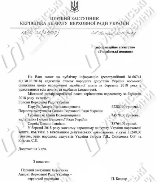 Кроме того, Парубию, Геращенко и Сыроид в марте были начислены по 35 240 гривен каждому в качестве средств, связанных с выполнением депутатских полномочий.