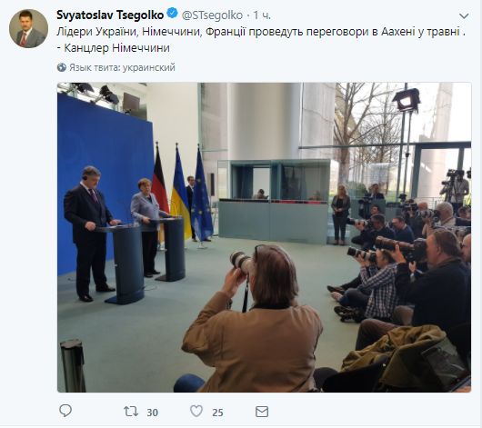 "Лидеры Украины, Германии, Франции проведут переговоры в Аахене в мае", - отметил он.