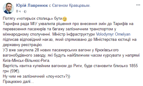"Укрзализныця" уже закупила 28 новых пассажирских вагонов у Крюковского вагоностроительного завода, которые будут в ближайшее время курсировать в направлении Киев-Минск-Вильнюс-Рига. Стоимость билета в купейном вагоне в Ригу, будет составлять около 1855 грн (59 €)", - написал заместитель министра.
