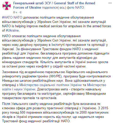 "НАТО помогает улучшить медицинское обслуживание военнослужащих в Вооруженных Сил Украины, которые подверглись ампутации, из-за новой двухлетней программы в Институте протезирования и ортопедии в Харькове. При финансировании трастового фонда НАТО по медицинской реабилитации для Украины, бакалаврская программа поможет повысить уровень оказания медицинских услуг для ампутантов соответствии с международными стандартами", - говорится в сообщении.