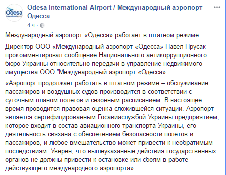 Международный аэропорт "Одесса" продолжает работу в штатном режиме, несмотря на сообщение Национального антикоррупционного бюро Украины относительно передачи аэропорта Нацагентству по управлению активами (АРМА). Об этом сообщил директор Павел Прусак, отмечается на странице аэропорта в Facebook.