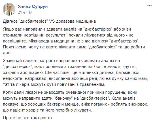 "В мире нет единых стандартов". Супрун отменила диагноз "дисбактериоз"
