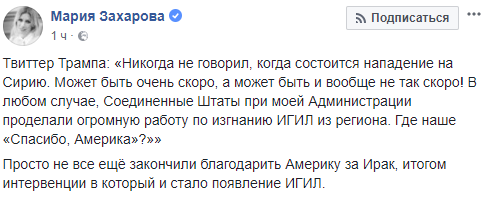 Официальный представитель МИД РФ Мария Захарова в ответ на сообщение Трампа в соцсети напомнила, что террористическая группировка "Исламское государство" появилась в результате действий США. Об этом Захарова написала на своей странице в Facebook.