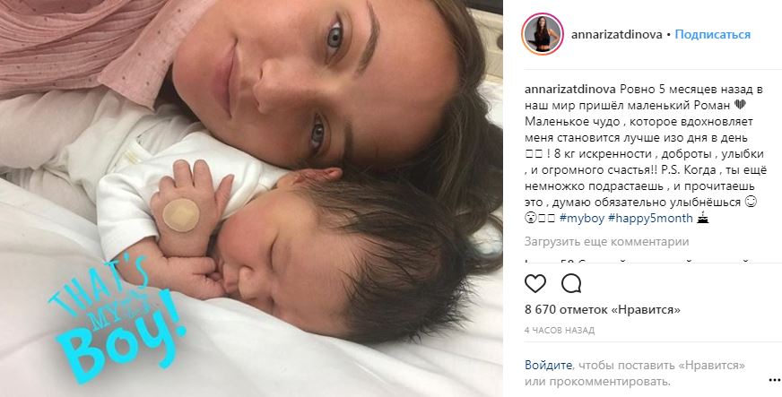 "Ровно пять месяцев назад в наш мир пришел маленький Роман, маленькое чудо, которое вдохновляет меня становиться лучше изо дня в день. 8 кг искренности, доброты, улыбки и огромного счастья!" - подписала фото Ризатиднова.
