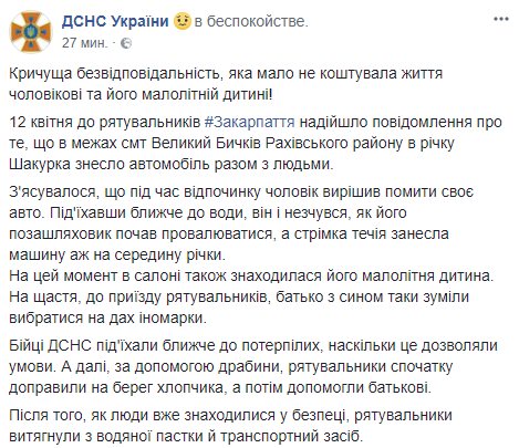 12 апреля в 14:15 спасателям сообщили о том, что в пределах пгт Великий Бычков Раховского района в реку Шакурка снесло автомобиль вместе с людьми.