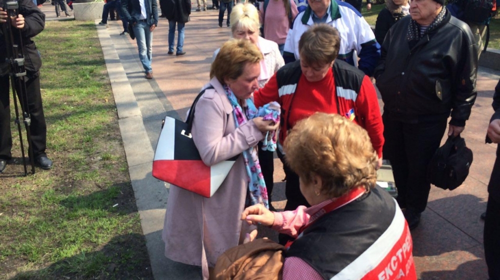 "Коммунистические шкуры, станьте на колени перед ветеранами украино-российской войны!" – воззвал к ветеранам Карась в свой громкоговоритель.