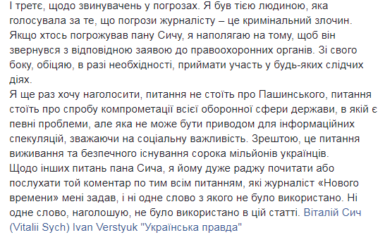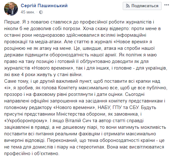 "Статью в журнале "Новое время" я расцениваю не как атаку на меня. Это, скорее, атака на попытки нашего государства повысить обороноспособность нашей армии. Как политик я имею право на такую позицию и готов ее обоснованно доказывать как для журналистов "Нового времени", так и для других, и главное - для украинцев, которые уже 4 года живут в состоянии войны", - написал Пашинский.