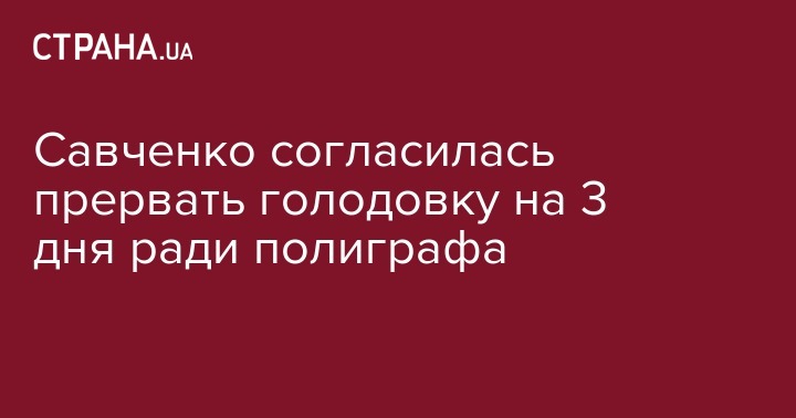 Находящаяся в СИЗО народный депутат Украины Надежда Савченко решила прервать голодовку на три дня. Это необходимо для прохождения судебно-психологической экспертизы на полиграфе.