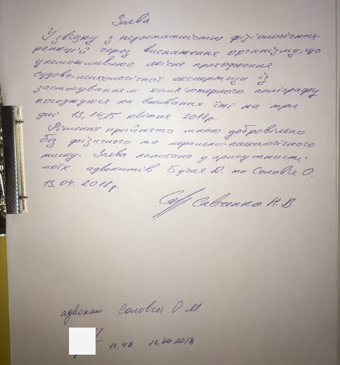 "В связи с недостаточностью физиологических реакций из-за истощения организма, что делает невозможным качественное прохождение судебно-психологической экспертизы с применением компьютерного полиграфа, соглашаюсь на употребление пищи на три дня 13, 14, 15 апреля 2018 г.", - говорится в заявлении Савченко, текст которого представил адвокат.