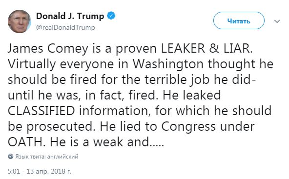 Президент США Дональд Трамп в ответ на публикацию отрывков из книги бывшего директора ФБР Джеймса Коми заявил, что Коми - известный лжец и человек, "сливающий" важную информацию.