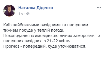 "Киев в ближайшие выходные и на следующей неделе побудет в теплой погоде. Похолодание с вероятностью ночных заморозков - со следующих выходных, с 21-22 апреля. Прогноз - предварительный, будет уточняться", - написала она в Facebook.