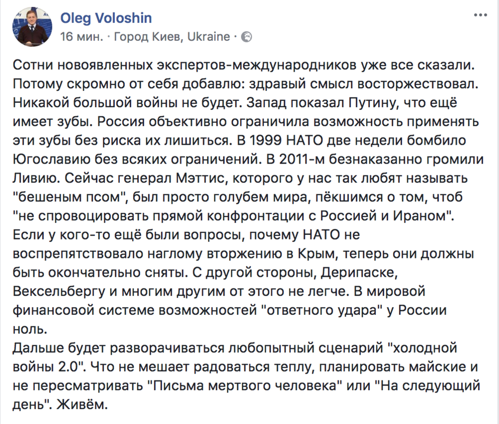 "Никакой большой войны не будет. Запад показал Путину, что ещё имеет зубы. Россия объективно ограничила возможность применять эти зубы без риска их лишиться. В 1999 НАТО две недели бомбило Югославию без всяких ограничений. В 2011-м безнаказанно громили Ливию. Сейчас генерал Мэттис, которого у нас так любят называть "бешеным псом", был просто голубем мира, пёкшимся о том, чтоб "не спровоцировать прямой конфронтации с Россией и Ираном". Если у кого-то ещё были вопросы, почему НАТО не воспрепятствовало наглому вторжению в Крым, теперь они должны быть окончательно сняты. С другой стороны, Дерипаске, Вексельбергу и многим другим от этого не легче. В мировой финансовой системе возможностей "ответного удара" у России ноль. Дальше будет разворачиваться любопытный сценарий "холодной войны 2.0". Что не мешает радоваться теплу, планировать майские и не пересматривать "Письма мертвого человека" или "На следующий день". Живём", - написал Олег Волошин.