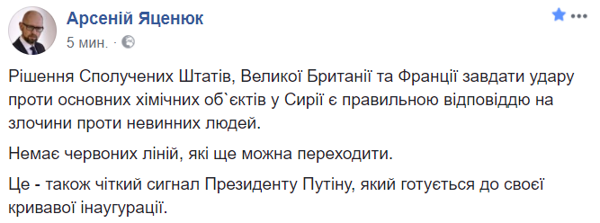Есть красные линии, которые нельзя переходить. Это - также четкий сигнал Президенту Путину, который готовится к своей кровавой инаугурации", - написал Яценюк в Facebook.