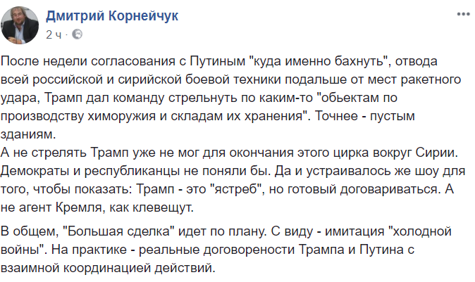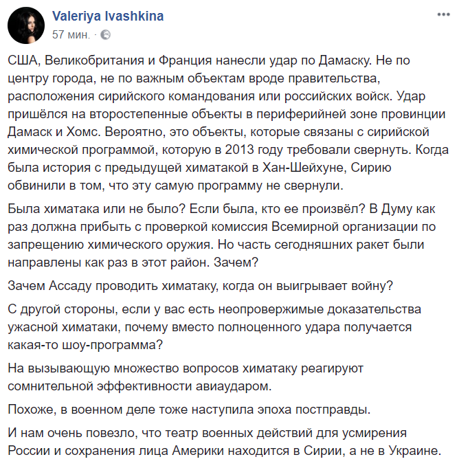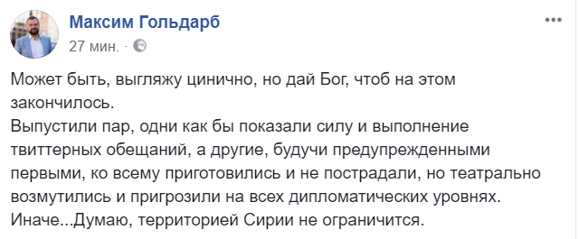 "Ночью США бомбили не Сирию, а старый миропорядок и амбиции России. Ракеты принесли послание о том, что союз с РФ не является гарантией безопасности, а российская ПВО ограничено эффективна. При чем удары до проводения расследования (комиссия ОЗХО начнет работу только в субботу) и серьезных доказательства демонстрирует, что система международного права не функционирует - доминирует только пещерное право сильного.