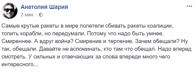 "Самые крутые ракеты в мире полетели сбивать ракеты коалиции, топить корабли, но передумали. Потому что надо быть умнее. Смиреннее. А вдруг война? Смирение и терпение. Зачем обещали? Ну так, обещали. Давайте не вспоминать, кто там что обещал. Надо вперед смотреть. У сильных и отвечающих за слова впереди много чего интересного...".