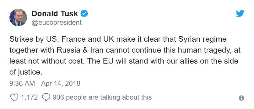 Глава Европейского совета Дональд Туск поддержал ракетный удар США и союзников по Сирии. Об этом он сообщил в своем Twitter.
