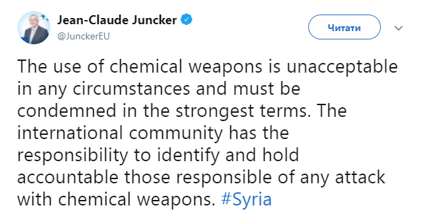 В свою очередь, председатель Еврокомиссии Жан-Клод Юнкер осудил применение химического оружия в Сирии. Об этом он также сообщил в Twitter.