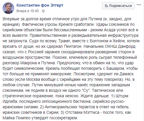 Но, в любом случае, Путин минувшей ночью нанёс поражение западным союзникам, не подняв в воздух ни одного "Су". Тактическое или стратегическое поражение, пока неясно. Ждите дальше: 1) Штурм Идлиба, последнего оппозиционного бастиона, сирийско-русско-иранскими силами; 2) Антиизраильских терактов в ответ на гибель иранских советников в Сирии; 3) Отставки Мэттиса – после того, как Майка Помпео утвердят госсекретарем", – написал фон Эггерт.