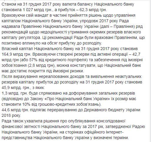 "После вычета нереализованных доходов и высвобождения неактуальных резервов капитала прибыль к распределению на 31 декабря 2017 составила 45,9 млрд грн. Из указанной суммы 1,3 млрд грн будет направлено на формированию общих резервов (в соответствии с законом "О Национальном банке Украины" их размер должен составлять 10% от денежно-кредитных обязательств), 44,6 млрд грн подлежит перечислению в госбюджет Украины 2018 года", - указал глава Совета НБУ.