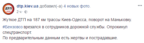 На трассе Киев-Одесса во вторник, 17 апреля, бензовоз на полном ходу врезался в работников дорожной службы. Об этом на своей странице в соцсети Facebook сообщает dtp.kiev.ua.