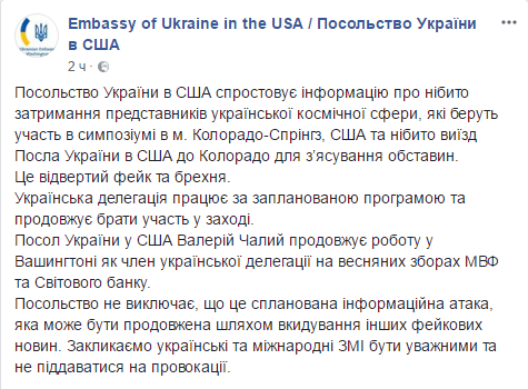 "Посольство Украины в США опровергает информацию о якобы задержании представителей украинской космической сферы, участвующих в симпозиуме в г.Колорадо-Спрингс, США, и якобы выезде посла Украины в США в Колорадо для выяснения обстоятельств. Это откровенный фейк и ложь", - говорится в сообщении посольства на странице в Facebook.