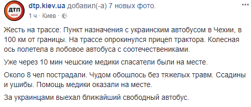"Жесть на трассе: Пункт назначения с украинским автобусом в Чехии, в 100 км от границы. На трассе опрокинулся прицеп трактора. Колесная ось полетела в лобовое автобуса с соотечественниками", - говорится в сообщении.