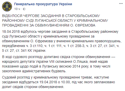 18 апреля Старобельский райсуд Луганской области на заседание по делу экс-главы фракции Партии регионов и бывшего губернатора Луганской области Александра Ефремова допросил нардепа Олега Ляшко в качестве свидетеля.