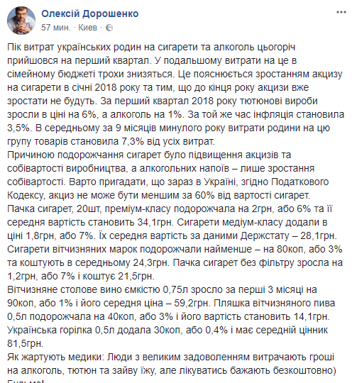 За первый квартал 2018 табачные изделия выросли в цене на 6%, а алкоголь на 1%. За то же время инфляция составила 3,5%. В среднем за 9 месяцев прошлого года расходы семьи на эту группу товаров составила 7,3% от всех расходов.
