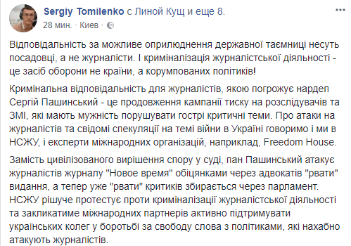 "Уголовная ответственность для журналистов, которым угрожает нардеп Сергей Пашинский - это продолжение кампании давления на расследователей и СМИ, которые имеют мужество поднимать острые критические темы. Об атаках на журналистов и сознательных спекуляциях на теме войны в Украине говорим и мы в НСЖУ, и эксперты международных организаций, например, Freedom House.