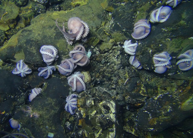 Ученые насчитали там более 600 самок осьминогов рода Muusoctopus, которые были собраны в "кластеры" на небольшой территории, причем часть из них охраняла кладки яиц.